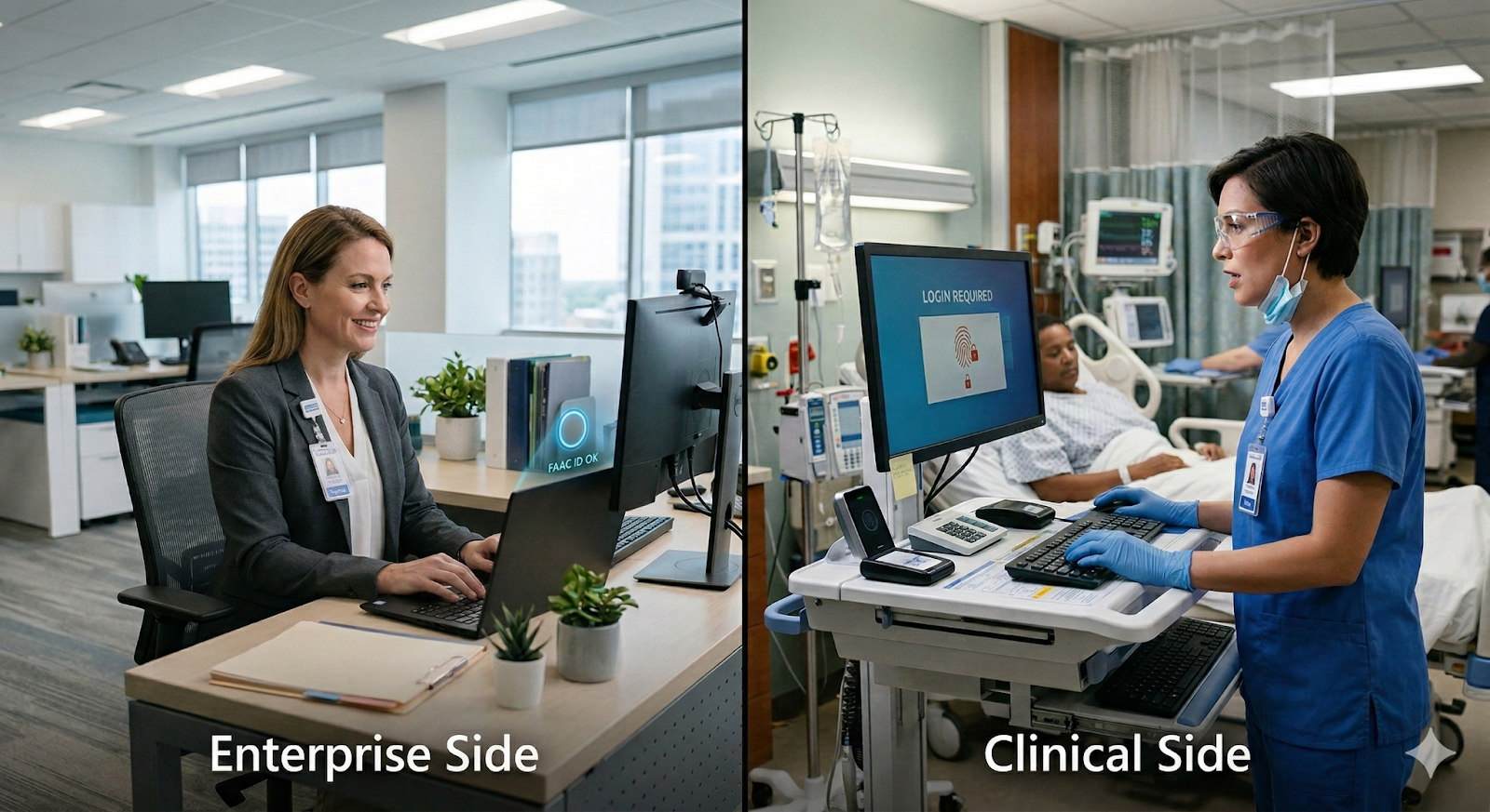 - Uniform Experience: Whether logging in at a shared workstation in a clinical environment or opening a laptop in an office on the enterprise side, authentication is consistent and invisible.